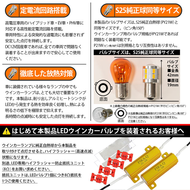 | S25純正球同等サイズ | S25純正バルブと同等サイズなので、バルブ型式[PY21W]・口金形状[BAU15s]であれば安心してお使いいただけます。 | |||
