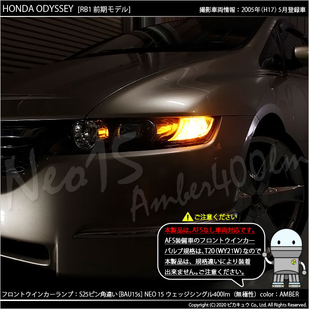 ◆本製品は、純正白熱球と交換するLEDバルブです。純正のLEDランプには装着出来ません。 ◆ウインカーランプに本製品のみを取り付けて点灯させると、ハイフラッシャー(高速点滅)状態になります。別途、LED専用ハイフラッシャー防止抵抗ユニット(8Ω)をお買い求めください。抵抗ユニットは、ウインカーLEDバルブ1個につき1つご使用ください。 ◆リアウインカーランプは規格が異なりますのでご注意ください。 ◆車種によっては、車両型式が一致していても、特別仕様車やオプション品などの条件により、商品ページに記載されている情報と異なる場合がございます。必ずご購入前に車両に装着されているバルブの形状(バルブ規格)をご確認ください。 ◆本製品は、AFSなし車両対応です。AFS装備車のフロントウインカーバルブ規格は、T20(WY21W)なので、本製品は、規格違いにより装着出来ません。ご注意ください。 [画像車両:オデッセイ 型式:RB1 平成17年5月登録車両] | ||||