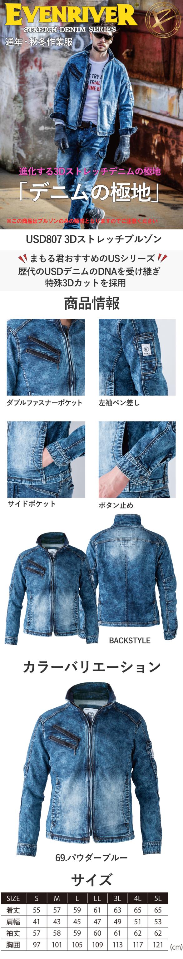 作業服 デニム イーブンリバー EVENRIVER ストレッチパウダーデニムブルゾン USD807 作業着 通年 秋冬