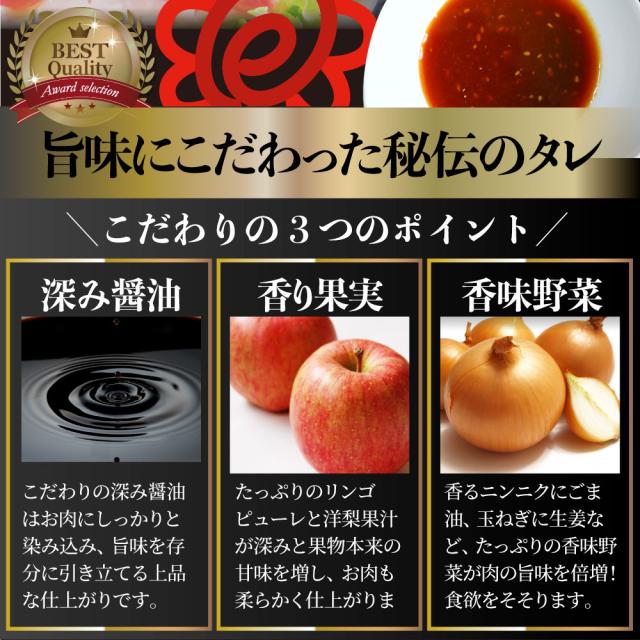 【原材料】牛肉(国産、アメリカ産、オーストラリア産)、本みりん(国内製造)、本醸造しょうゆ、ぶどう糖果糖液糖、砂糖、米みそ、りんご、食塩、醸造酢、ごま、にんにく、生姜、植物油脂、ごま油、ラー油、発酵調味料、乾燥玉ねぎ、リンゴピューレ、濃縮西洋なし果汁、ビーフエキス、香辛料/調味料(アミノ酸等)、増粘剤(加工でん粉、キサンタンガム)、カラメル色素、酒精、V.B?、酸味料、香料、香辛料抽出物(一部に小麦・大豆・りんご・ごま・乳成分・豚肉・鶏肉・ゼラチンを含む)