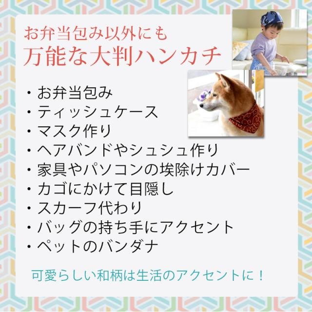 | ご使用方法 | 弁当包み以外にも様々な用途でご使用いただけます。・ティッシュボックス包み・マスク作り・ヘアバンドやシュシュなどの小物のハンドメイド・家具やパソコンなどの埃除け・カゴにかけて収納の目隠し・スカーフの代わり・バッグの持ち手のアクセント・ペットのバンダナ・プレゼントやギフト、祝儀袋などの贈り物の包み 万能な大判ハンカチは何枚有っても嬉しいですね! |