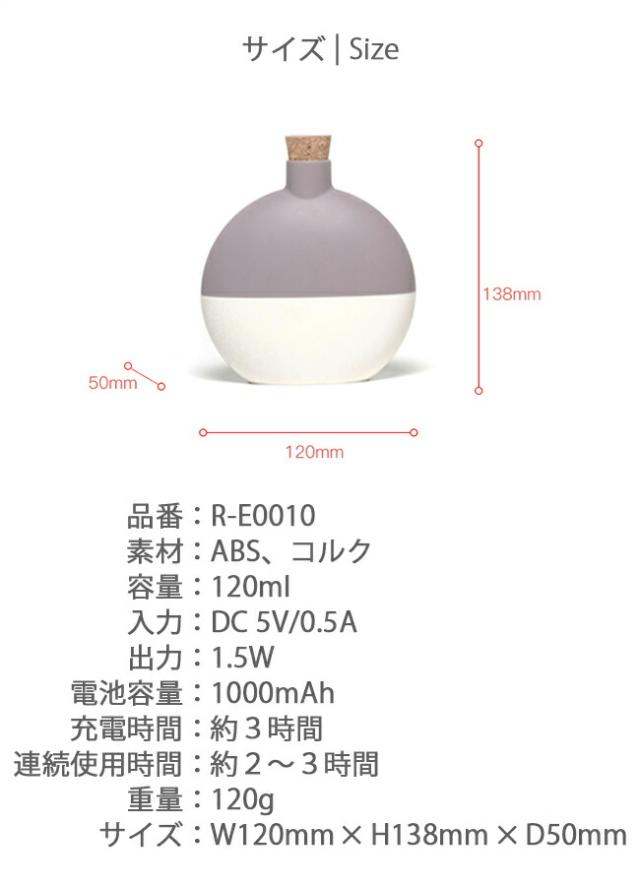 | <セット内容>加湿機本体、USBケーブル、フィルター(1本)、取扱説明書 ●素材/材質:ABS、コルク ●本体サイズ:約12x13.8x5cm ●重量:120g ●タンク容量:120ml ●電池容量:1000mAh ●充電時間:約3時間 ●連続使用時間:約2~3時間(満充電の状態でコードレス使用した場合) ●空焚き防止機能:連続使用時間5時間が経過すると自動で運転停止 ●生産国:中国 | ||||