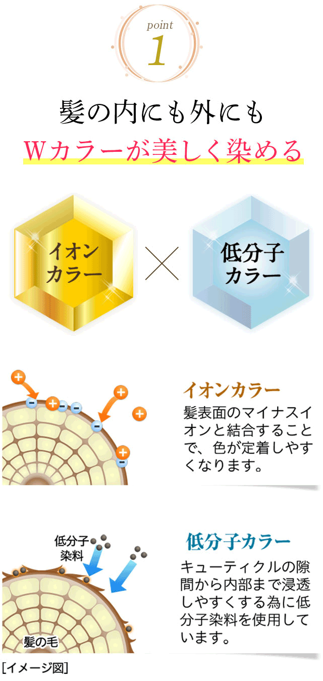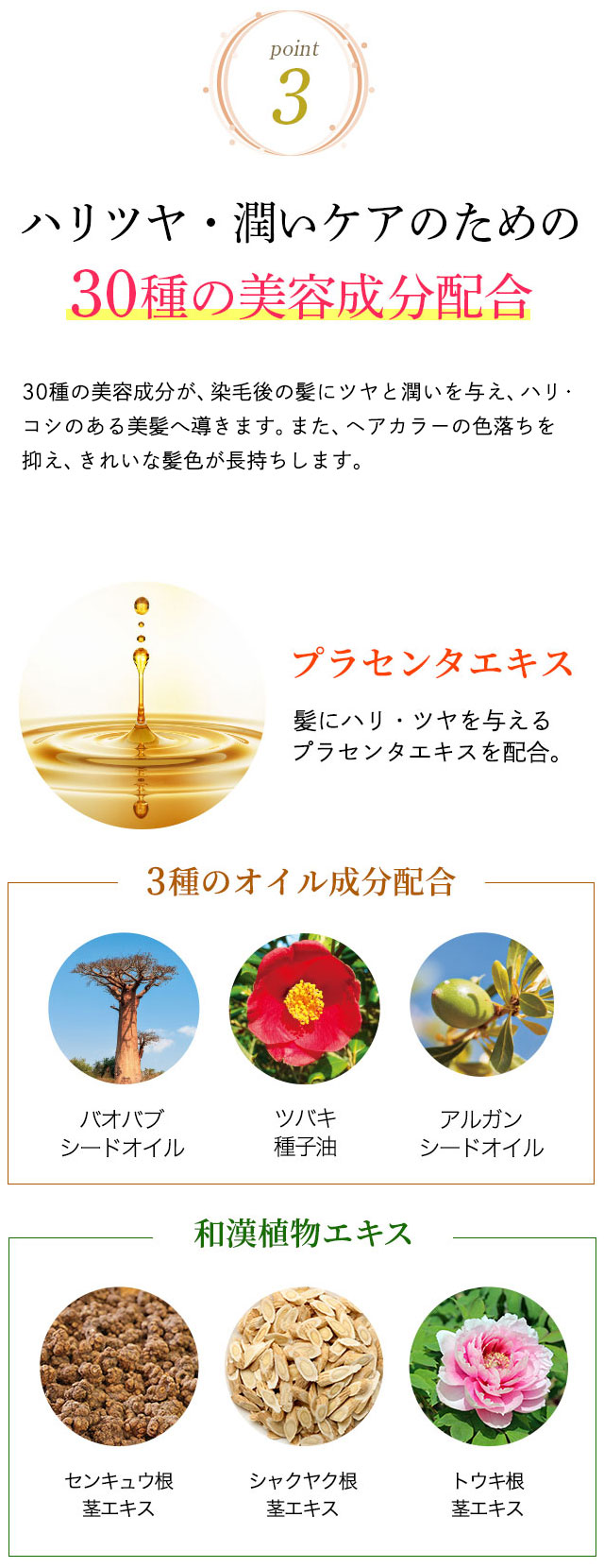 | 水、(ラウリル/ミリスチル)グリコールヒドロキシプロピルエーテル、コカミドプロピルベタイン、ラウロアンホ酢酸Na、ラウラミンオキシド、塩化Na、BG、尿素、アルガニアスピノサ核油、バオバブ種子油、ツバキ種子油、プラセンタエキス、トウキ根エキス、センキュウ根茎エキス、シャクヤク根エキス、メドウフォーム—δ—ラクトン、ゼイン、キトサンヒドロキシプロピルトリモニウムクロリド、加水分解ヒアルロン酸、加水分解コラーゲン、サトウキビエキス、ワサビノキ種子エキス、酸化銀、アシタバ葉/茎エキス、アセチルヘキサペプチド—1、ヘマチン、加水分解ケラチン(羊毛)、ニンニク根エキス、ローマカミツレ花エキス、ゴボウ根エキス、アルニカ花エキス、セイヨウキズタ葉/茎エキス、オドリコソウ花/葉/茎エキス、オランダガラシ葉/茎エキス、ローズマリー葉エキス、セイヨウアカマツ球果エキス、コンフリー葉エキス、グリチルリチン酸2K、ベルガモット果実油、オレンジ油、グリシン、トコフェロール、ホウケイ酸(Ca/Na)、デキストラン、グリセリン、DPG、クエン酸、炭酸水素アンモニウム、キサンタンヒドロキシプロピルトリモニウムクロリド、ポリクオタニウム—49、ヤシ油脂肪酸PEG—7グリセリル、フェノキシエタノール、エタノール、(+/—)塩基性青99、HC青2、塩基性茶16、塩基性赤76、4—ヒドロキシプロピルアミノ—3—ニトロフェノール、HC黄2、HC黄4 |