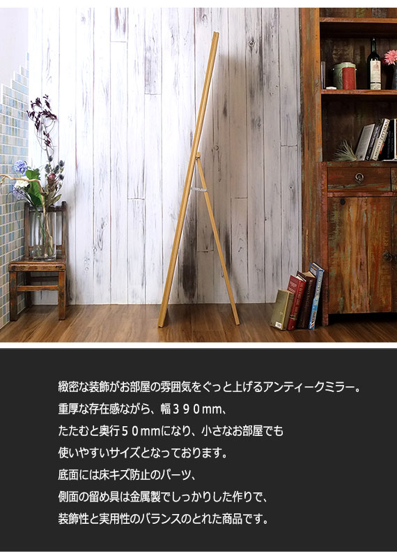 | 説明 | 緻密な装飾がお部屋の雰囲気をぐっと上げるアンティークミラー。重厚な存在感ながら、幅390mm、たたむと奥行50mmになり、小さなお部屋でも使いやすいサイズとなっております。底面には床キズ防止のパーツ、側面の留め具は金属製でしっかりした作りで、装飾性と実用性のバランスのとれた商品です。 |