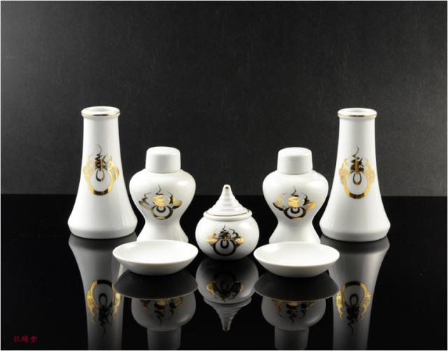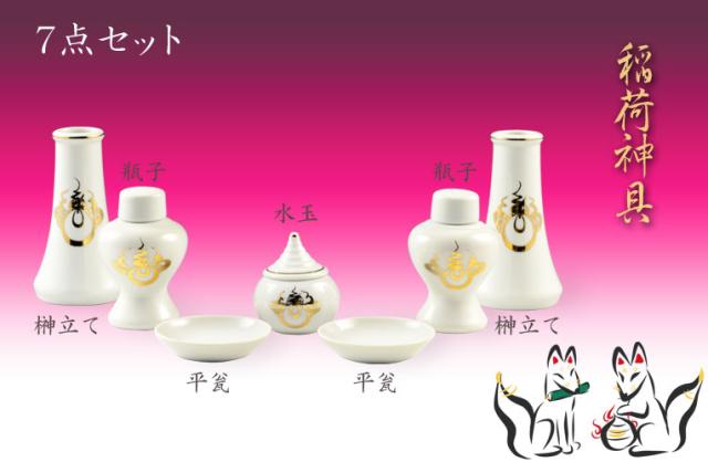 神具・稲荷社【国産神具:稲荷紋入り白陶器神具7点セット サイズ小】稲荷大明神 稲荷宮 お稲荷さん 御稲荷さま 金紋 神棚 祖霊舎 神徒壇 御霊舎 御霊代 神札 神社 神道