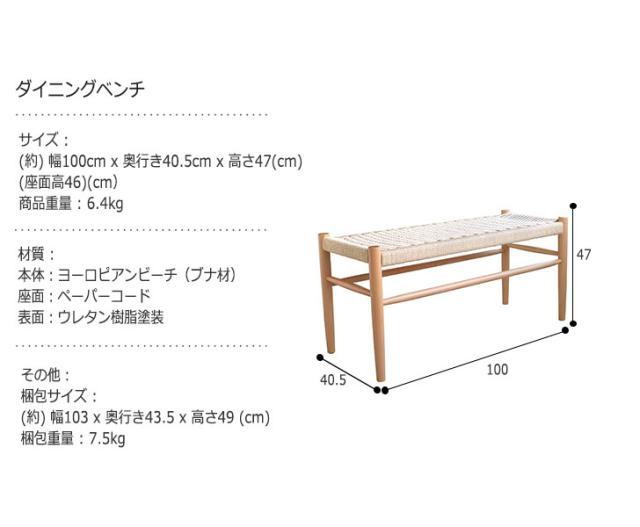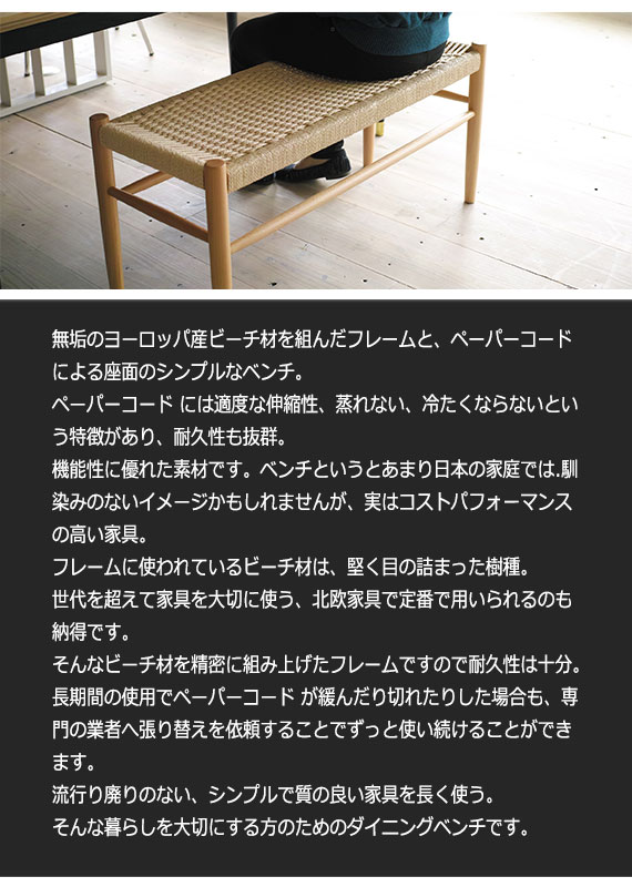 Bridge ブリッジ ダイニングベンチ (イス 椅子 木製 天然木 ペーパーコード ベンチ 腰掛 エントランス ナチュラル ウッド カントリー 店舗 高級感 モダン デザイナーズ リプロダクト シンプル おしゃれ おすすめ)