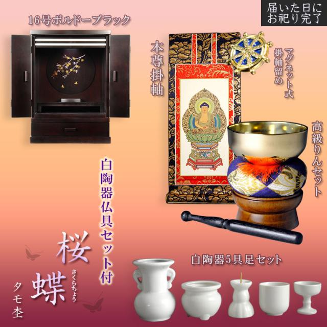 現代調モダン仏壇【天然タモ杢 幻想的で優美な絵柄:桜蝶(さくらちょう)16号ボルドーブラック+白陶器仏具一式付き】電池式高輝度ダウンライト付属 送料無料