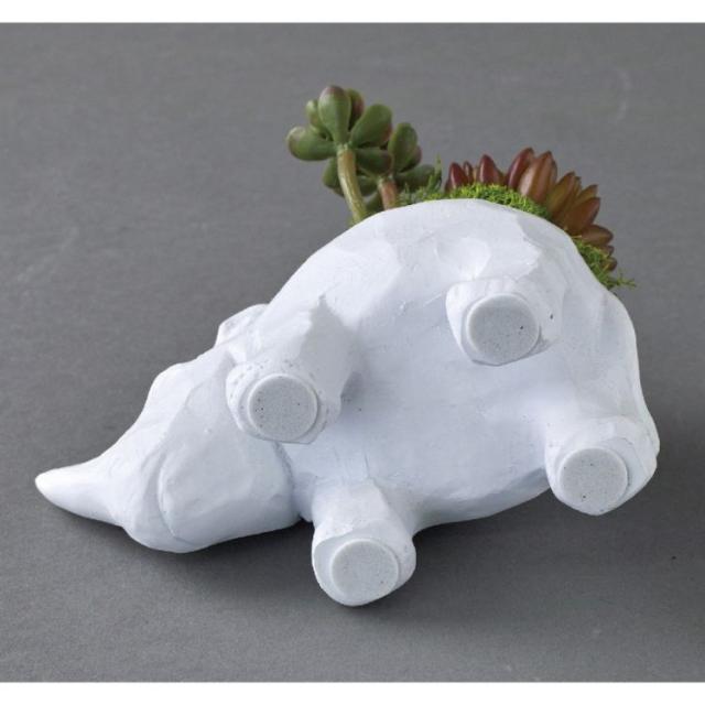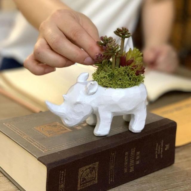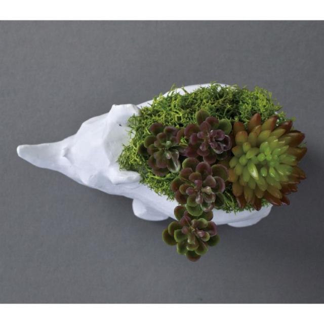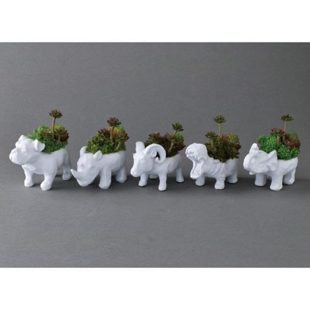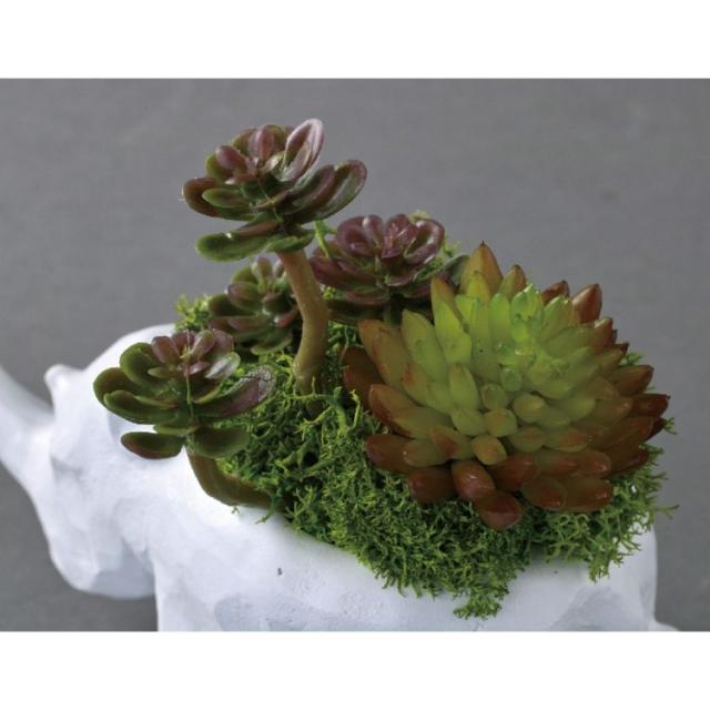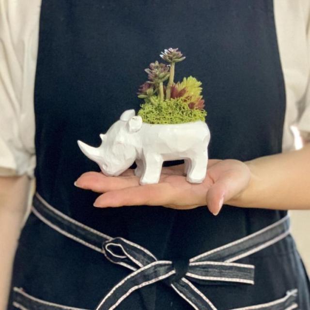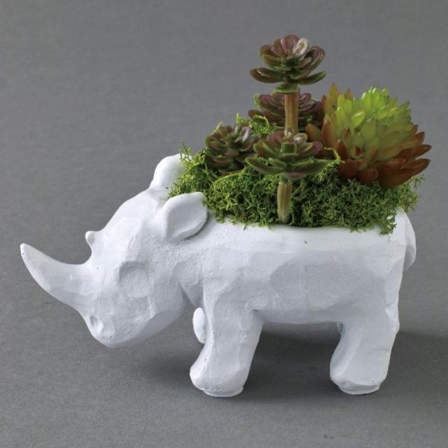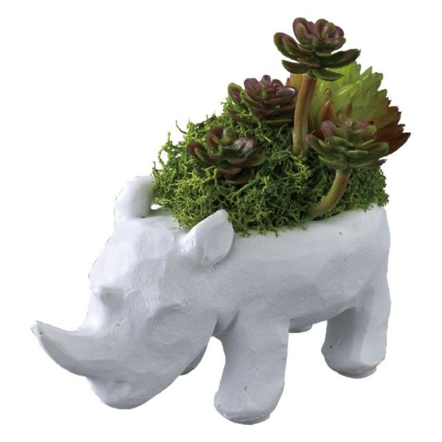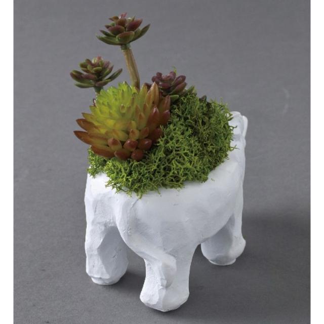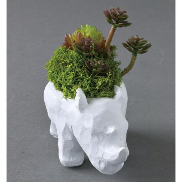 レジンでできたシンプルモダンな小さなサイの置物の背中に、フェイクグリーンとモスをアレンジしました。