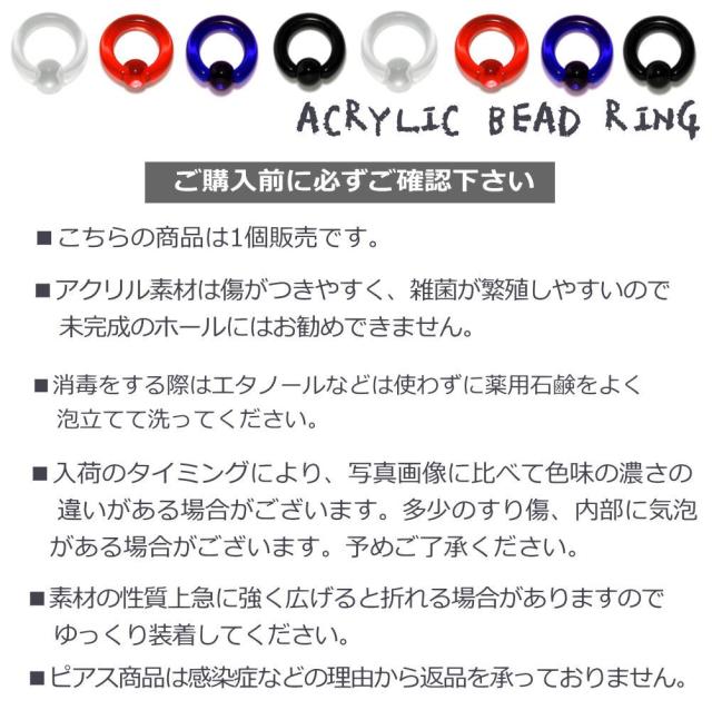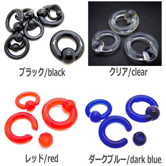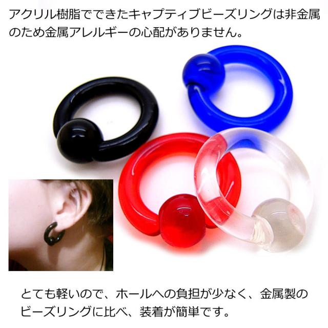 アクリル樹脂でできたキャプティブビーズリングは非金属のため金属アレルギーの心配がありません。とても軽いので、ホールへの負担が少なく、金属製のビーズリングに比べ、装着が簡単です。ホール系ピアスとコーディネートする『ホールトゥピアス』に使用される定番のアイテムです。