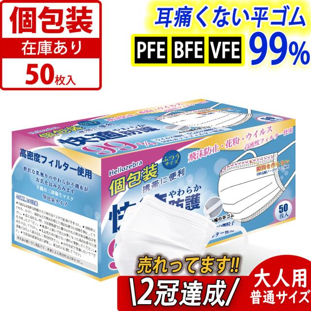 マスク 個包装 50枚箱入 使い捨てマスク 白 大人用 普通サイズ 三層構造 不織布マスク 飛沫防止 花粉対策 防護マスク 男女兼用 抗菌通気超快適 耳痛くならない