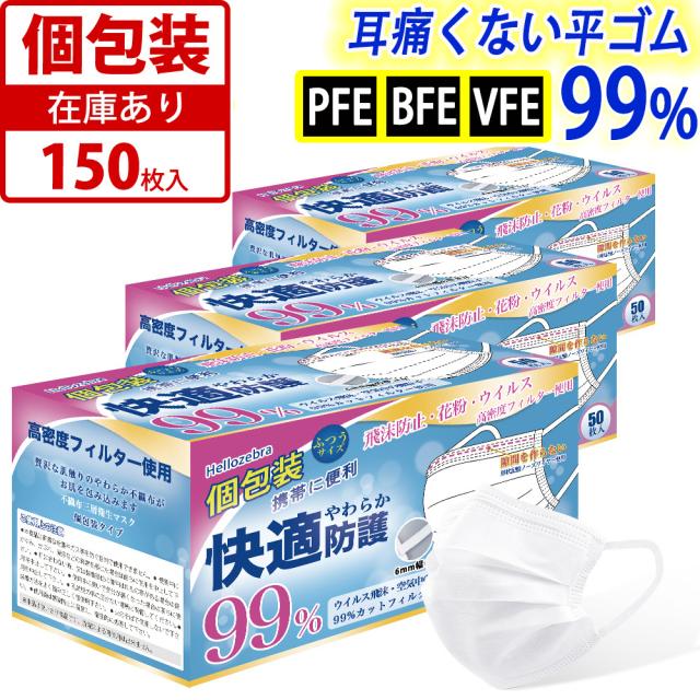 マスク 個包装 150枚入(50枚箱入x3箱) 使い捨て 不織布 マスク 白 大人用 普通サイズ 三層構造 飛沫花粉対策 防護マスク 男女兼用 抗菌通気超快適
