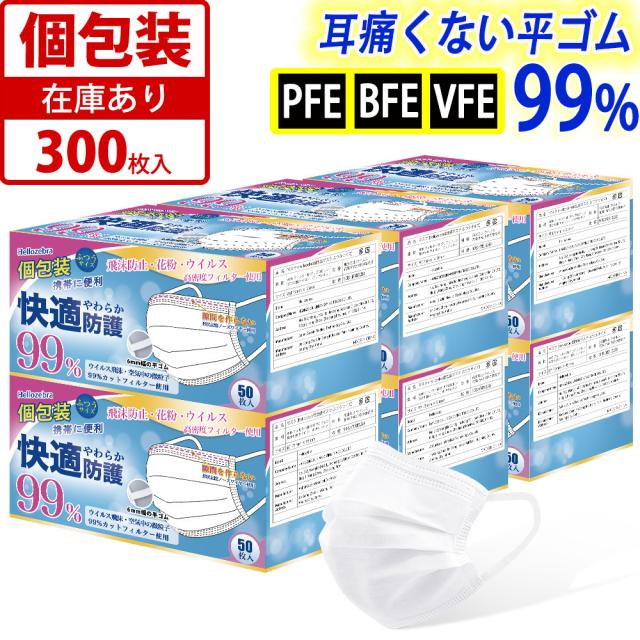 マスク 個包装 300枚入(50枚箱入x6箱) 使い捨て 不織布 マスク 白 大人用 普通サイズ 三層構造 飛沫花粉対策 防護マスク 男女兼用 抗菌通気超快適