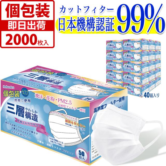 マスク 個包装 2000枚入(50枚箱入x40箱) 使い捨て 不織布 マスク 白 大人用 普通サイズ 三層構造 飛沫花粉対策 防護マスク 男女兼用 抗菌通気超快適