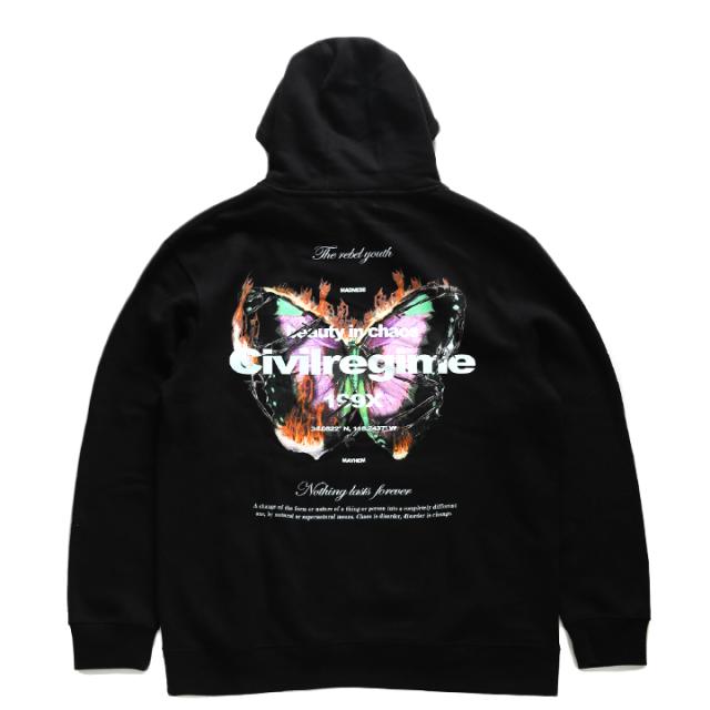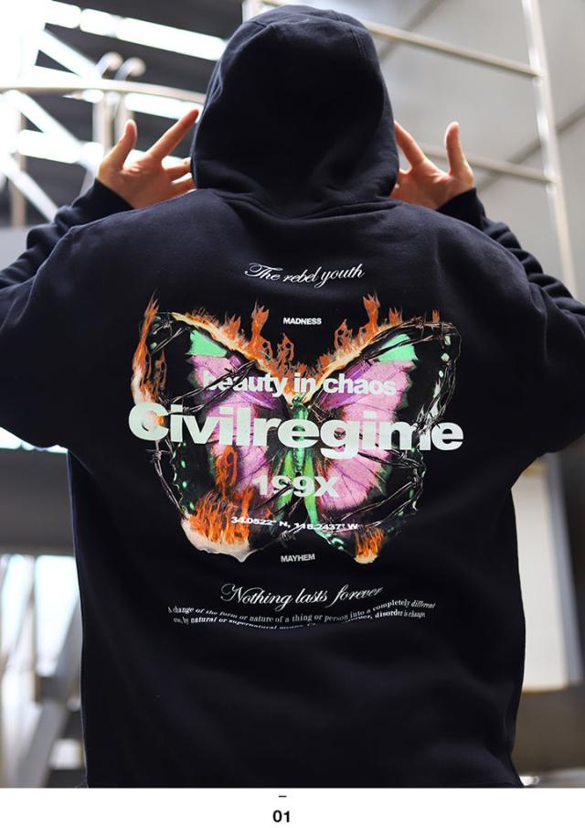 ラスト1点【50%OFF】CIVIL REGIME パーカー プルオーバー ブランド スケボー 長袖 スウェット 裏起毛 メンズ レディース 春秋冬用 ブラック 黒 シヴィルレジーム フードパーカー おしゃれ かっこいい 鉄条網 蝶 ファイヤーパターン 20CV-AW06H