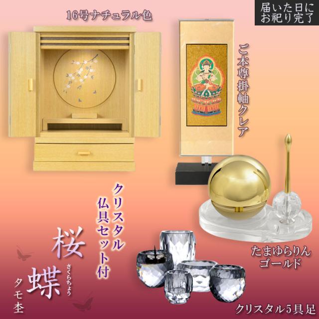 現代調モダン仏壇【天然タモ杢 幻想的で優美な絵柄:桜蝶(さくらちょう)16号ナチュラル色+クリスタル器仏具一式付き】電池式高輝度ダウンライト付属 送料無料