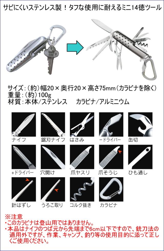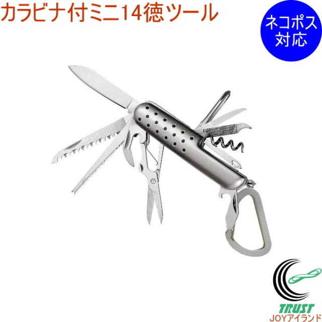 カラビナ付ミニ14徳ツール K-12 ネコポス対応 ナイフ コルク抜き はさみ 缶切り +-ドライバー カラビナ ネイルケア ファッション アウトドア 小物 便利ツール キャンプ