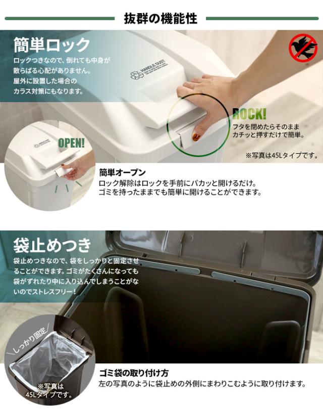 ゴミ箱 屋外 ごみ箱 おしゃれ 大容量 分別 ふた付き ロックつき アウトドアテイスト 外置き グリップ アースカラー 日本製 国産 ハンドル付 簡単ロック 屋外OK ゴミ箱 屑入れ くずかご アウトドアライク 資源ごみ 缶 カン 瓶 ビン プラスチック ペットボトル 不燃ごみ 密閉 プラスチック製 車庫 ガレージ ベランダ バルコニー カラス対策 倒れにくい 袋止め付き ロック機能 風に強い 倒れても安心 安定感 園芸用 ワンタッチ 片手で開けられる 便利 おすすめ 使いやすい スタイリッシュ コンパクト 省スペース スリム 人気 デザイン おしゃれ 臭わない 家庭用 店舗用 3個セット ホワイト グリーン ブラウン 4974908672798