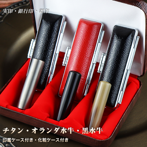 【7999円!実印+銀行印+認印 印鑑3本セット】 サイズ選らべる 印材選べる 黒水牛印鑑 チタン 印鑑 オランダ水牛 印鑑 実印 銀行印 認印 はんこ 10年保証 印影確認 子供 名前 判子 実印+銀行印+認印 3本セット 印鑑ケース3個 化粧ケース付き
