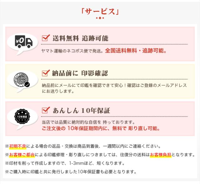 お客様が当店にてお買い上げいただいた印鑑は、ご購入日より、10年以内であれば、無料で彫り直しをいたします。(送料は往復分ご負担ください。)