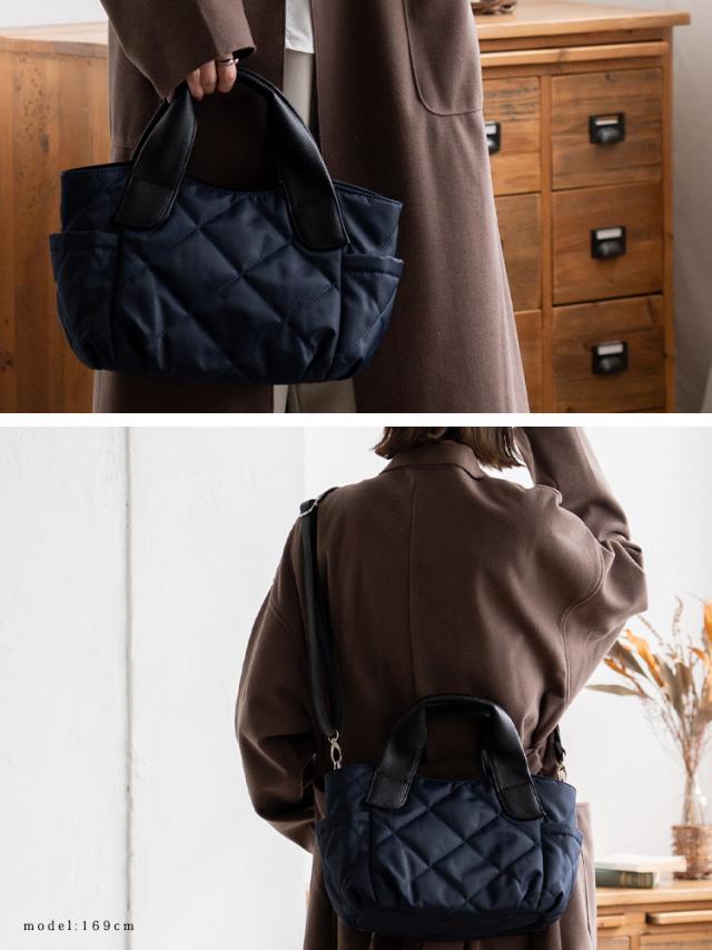 大きめのキルティングが女性らしい2wayトートバッグ。