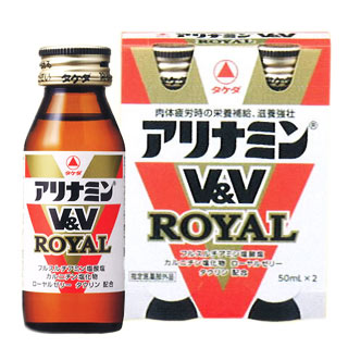 アリナミン V&Vロイヤル 50mL×2本アリナミン V&Vロイヤル 50mL×2本 『アリナミン V&Vロイヤル 50mL×2本 』フルスルチアミン塩酸塩カルニチン塩化物ローヤルゼリー タウリン 配合○肉体疲労・病中病後・食欲不振・栄養障害・発熱性消耗性疾患・産前産後などの場合の栄養補給○滋養強壮○虚弱体質区分:医薬部外品【アリナミン V&Vロイヤル 50mL×2本 詳細】1ビン(50mL)中フルスルチアミン塩酸塩(ビタミンB1誘導体)10mgリボフラビンリン酸エステルナトリウム(ビタミンB2リン酸エステル)15.25mgピリドキシン塩酸塩(ビタミンB6)10mgニコチン酸アミド60mgL-アスパラギン酸ナトリウム125mgタウリン(アミノエチルスルホン酸)1500mgカルニチン塩化物100mg無水カフェイン50mgローヤルゼリーチンキ500mg(ローヤルゼリー500mgに相当)添加物として ステビア抽出精製物、酒石酸、クエン酸