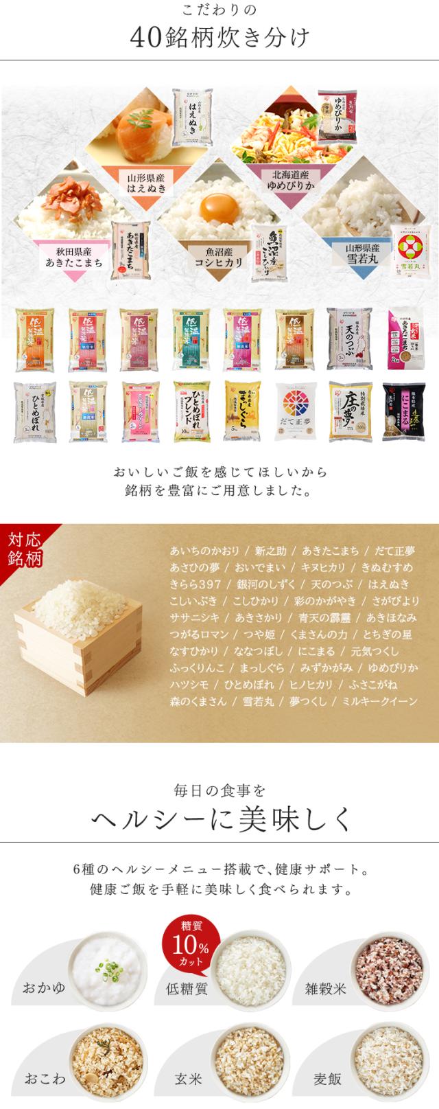 - お米の種類に合わせてご飯が炊けます。 固さやもっちり感等も選べます。 炊き上がったご飯が凄く美味しいです。 この炊飯器はおすすめです。