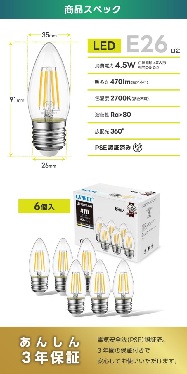| 商品名 | シャンデリア電球 E26口金 40W形相当 470LM LED フィラメント電球 2700K電球色 蝋燭型 クリア電球 省エネ 4.5W PSE認証済み 6個入 調光器非対応 |