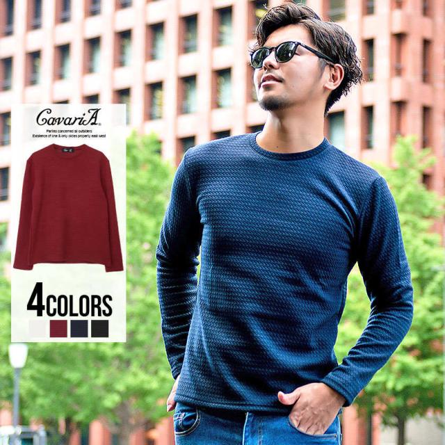 セール SALE Tシャツ メンズ 長袖 CavariA キャバリア キルティング千鳥柄クルーネック長袖Tシャツ 即日発送 トップス インナー カットソー ロンT 無地 細身 タイト ホワイト ワイン ネイビー ブラック 白 黒 M L 秋 冬 [CAST20-122]