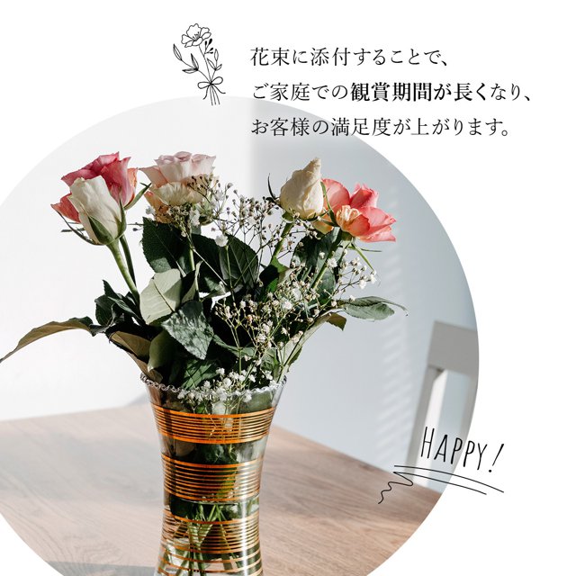 - 今迄近所の生花店で買っていました。1個25円で買ってました。凄いボッタクリの生花店でしたね。こちらのショップをもっと早くに知っていたら良かったです。仏花に毎日使っています。花の保ちが良いし、液体のも有りますが私はこちらの粉の方法が使いやすいです。またこちらのショップで購入したいと思います。