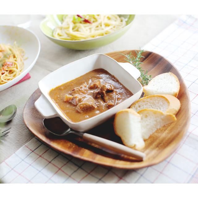【原材料】牛肉(国産)、シチューフレーク(小麦・鶏肉・豚肉・りんご・大豆を含む)、たまねぎ、デミグラスソースフレーク(乳成分・小麦・牛肉・鶏肉・豚肉・大豆・ゼラチンを含む)、砂糖、コンソメ(乳成分・小麦・牛肉・大豆を含む)、トマトペースト、コショウ /増粘剤(加工でんぷん)、調味料(アミノ酸等)、着色料(カラメル、トウガラシ色素)、香料、酸味料(乳酸等)