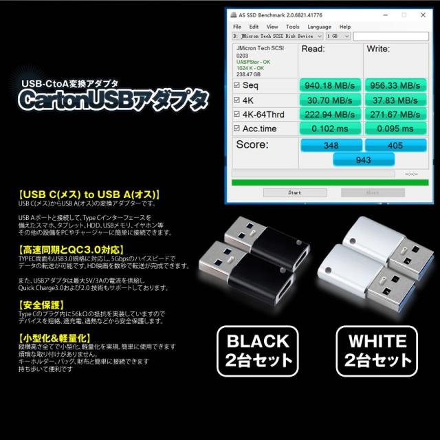 - Type-Aポートしかないパソコンに最近のType-C機器を使いたくて購入しました。 USB3.0対応なので高速にデータ転送できました。 黒を購入しましたが、パソコンによっては白が合う場合もあり、同色2個のセットしかありませんが、黒と白のセットがあれば良いと思います。