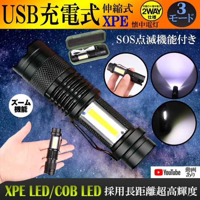 USB充電式懐中電灯 作業灯 XPE+COB LED 強力 超小型 軍用 防災 点滅 停電灯 高輝度 ハンディライト 伸縮ズーム フラッシュライト SK68USB