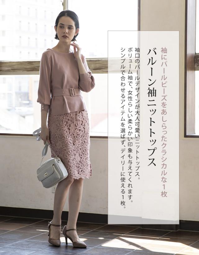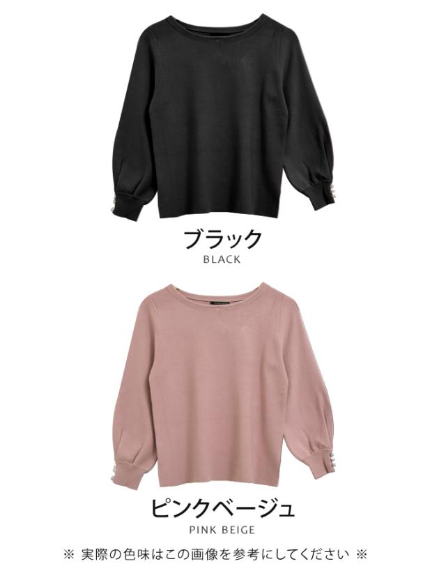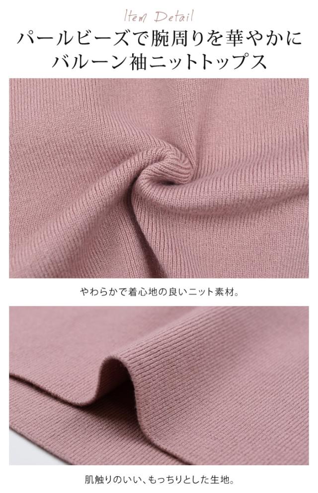 袖にパールビーズをあしらったクラシカルな1枚。バルーン袖ニットトップス。