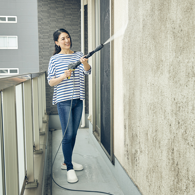 トリガーガンからノズルの先までの長さが従来品よりも短く、本体もとてもコンパクト。ベランダや密接した住宅の外壁など、狭い場所でも洗浄しやすいモデルです。また付属の高圧ホースは取り外しがしやすい「クイックコネクトシステム」を採用。さらに低温の季節でも硬くなりにくいしなやかなホースで、洗浄中の移動や片付けもスムーズに行うことができます。