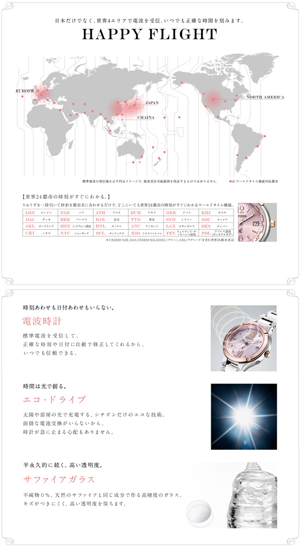 | 仕様 | 日常生活用防水(5気圧) 平均月差±15秒(非受信時) 駆動期間:フル充電時約3年(パワーセーブ作動時) パーペチュアルカレンダー パーフェックス搭載 パワーセーブ機能 ワールドタイム機能(24都市) サマータイム機能 日中米欧電波受信 受信局自動選択機能 定時受信機能 強制受信機能 衝撃検知機能 針自動補正機能 充電残量表示機能 充電警告機能 過充電防止機能 耐磁一種 夜光(針) 日本製 |