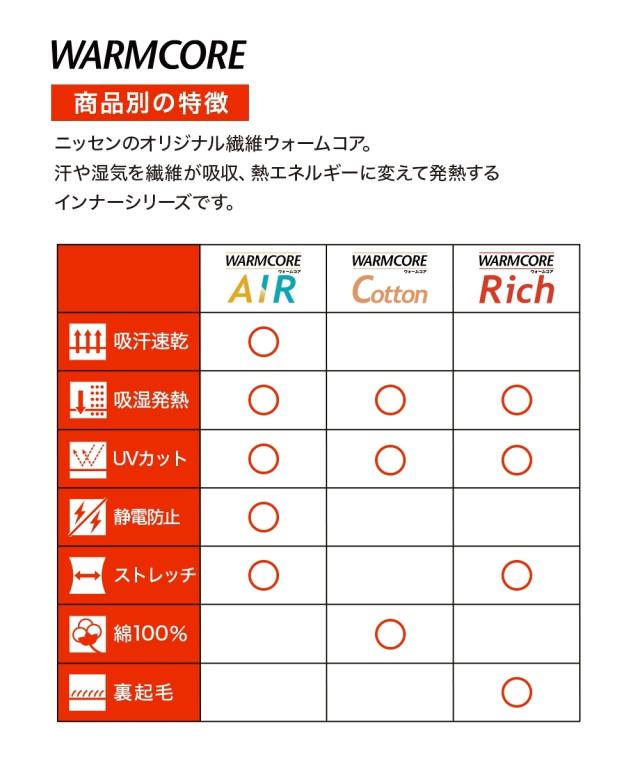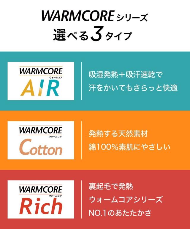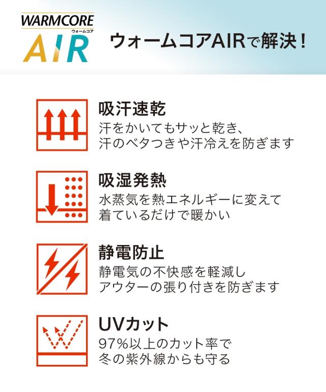 [keyword] 下着 ランジェリー インナー 大きいサイズ レディース 標準サイズ 普通サイズ ゆったりサイズ プラスサイズ UVカット 夏 外 おでかけ イベント 肌 レジャー 吸汗速乾 乾きやすい 吸湿発熱 あったか 冬 防寒 お買い得セット まとめ買い セット お得 [comment]暖かい そしてムレにくい 【ウォームコアAIR】 暑い寒いを快適にする新発想のあったかインナーです。・日中は暑いのに朝晩は冷える ・1日の気温差が大きい ・冬のインナーを着るには早いが、夏用のインナーはもう寒い ・暑いのか寒いのか何を着ていいかわからない そんなお悩みは、【ウォームコアAIR】で解決。 【ウォームコアAIR】は、発熱しながら、汗を素早く吸収・発散することで、快適な着用感を実現。 きっと毎日着たくなるここちよさです。 【特徴】・吸湿発熱 水分を熱に変換し、着ているだけで暖かい。・吸汗速乾 汗をかいてもサッと乾き、さらっと快適。※時期により商品が完売の場合がございます。※商品の色移りを防止するために個包装を行っている場合がございます。個包装はプラスチック削減のため一部の色のみに使用しています。
