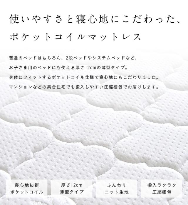 親子ベッドやロフトベッドに!【ポケットコイル/圧縮ロール梱包】薄型タイプ マットレス Pearl(パール) シングルサイズ 97x195cm シングル ポケットコイルマットレス マット mattress 二段ベッド シングルベッド