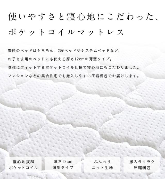 親子ベッドやロフトベッドに!【ポケットコイル/圧縮ロール梱包】薄型タイプ マットレス Pearl(パール) セミダブルサイズ 120x195cm セミダブル ポケットコイルマットレス マット mattress 二段ベッド セミダブルベッド