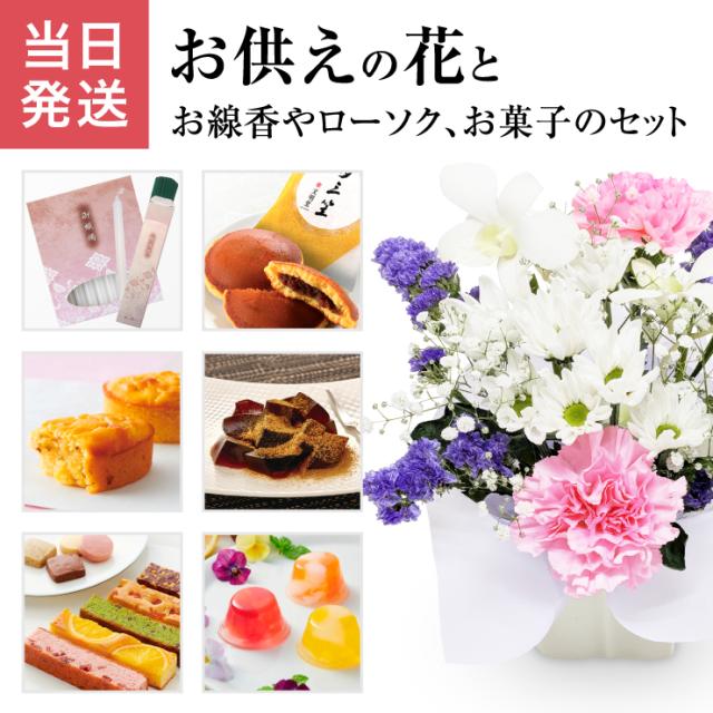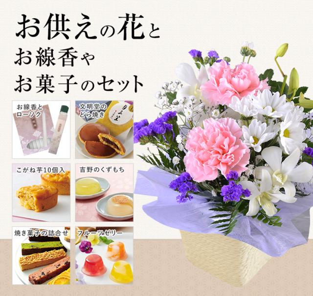 お供え 生花 お悔やみ アレンジメント 日本香堂 お線香 文明堂 どら焼き こがね芋 吉野の葛餅 命日 お彼岸 お盆 法事 法要 進物用 花 ギフト アレンジ フラワーギフト 東北〜関西 送料無料 花のギフト社