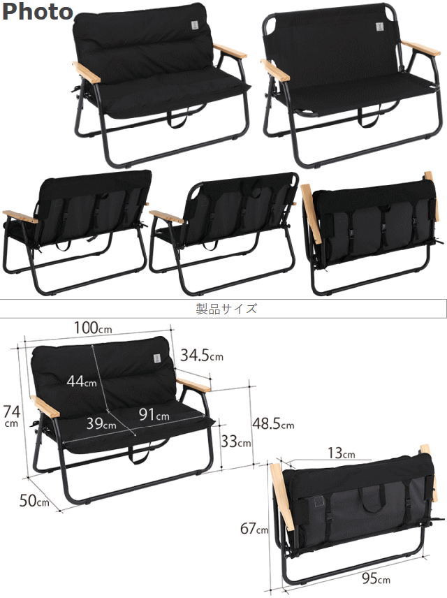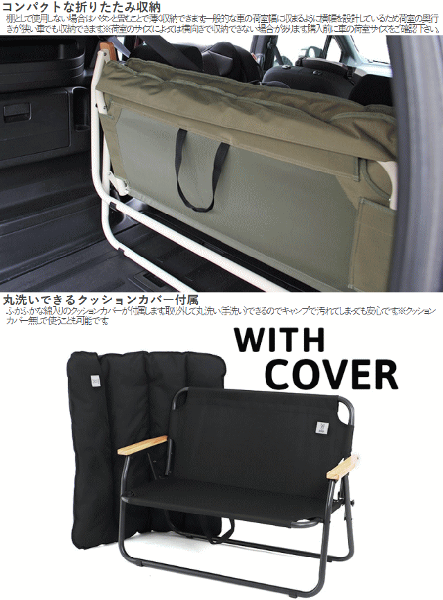 車の荷室に棚をつくる。キャンプ用品の車内収納の手助けをするキャンプがぐっと豪華になる2人掛けソファ。片手で運べるソファの最大のネックだった車内での収納のしづらさを改善し逆に収納の手助けをする棚として使用可能にしました。ふかふかな綿入りのクッションカバーが付属します。取り外して丸洗いできるのでキャンプで汚れてしまっても安心です。※クッションカバー無しで使う事も可能です。■カラー:ブラック■サイズ約W100×D50×H74cm■収納サイズ約W100×D13×H67cm■総重量約5.5kg■材質:アルミ合金、600Dポリエステル(PVCコーティング)、木、スチール(補強パイプ)■静止耐荷重200kg※荷室のサイズによっては棚として使用できない場合や横向きに収納できない場合があります。購入前に車の荷室サイズをご確認下さい。棚として使用する際には一部のフレームに荷重が集中しないように注意して下さい。生産工程上、フレームに小傷が発生している場合がございます。予めご了承下さい。