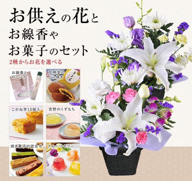 お供え 生花 お悔やみ アレンジメント 日本香堂 お線香 文明堂 どら焼き こがね芋 吉野の葛餅 命日 お彼岸 お盆 法事 法要 進物用 花 ギフト アレンジ フラワーギフト 東北〜関西 送料無料 花のギフト社