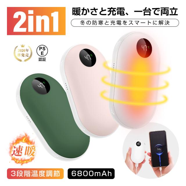 電気カイロ ハンドウォーマー モバイルバッテリー 6800mAh 大容量 2in1 3段階温度調整 繰り返し使える スマホ充電 長時間使用 あったかグッズ 小型軽量 持ち運び便利 寒さ対策 USB-A出力 Type-C充電 2026年新発売 贈り物 90日安心保証付 PSE認証【PL保険加入済み製品・安心】