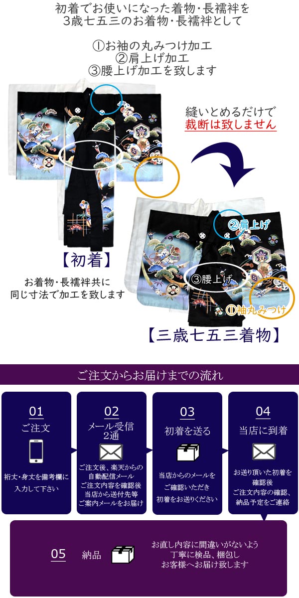 初着でご使用になられたお着物と長襦袢を、3歳七五三で着れるように、お袖を縫いとめる加工を致します。それと共に、お子様の寸法に合うよう、肩上げと腰上げを致します。