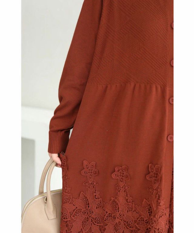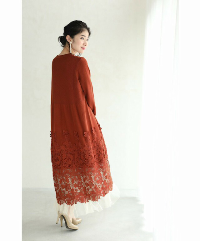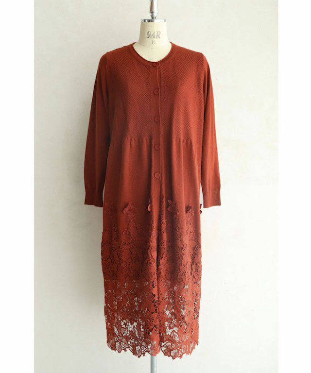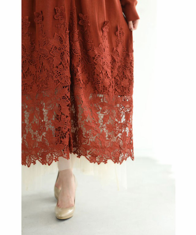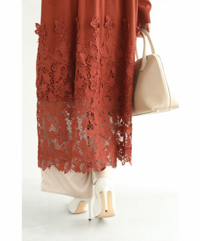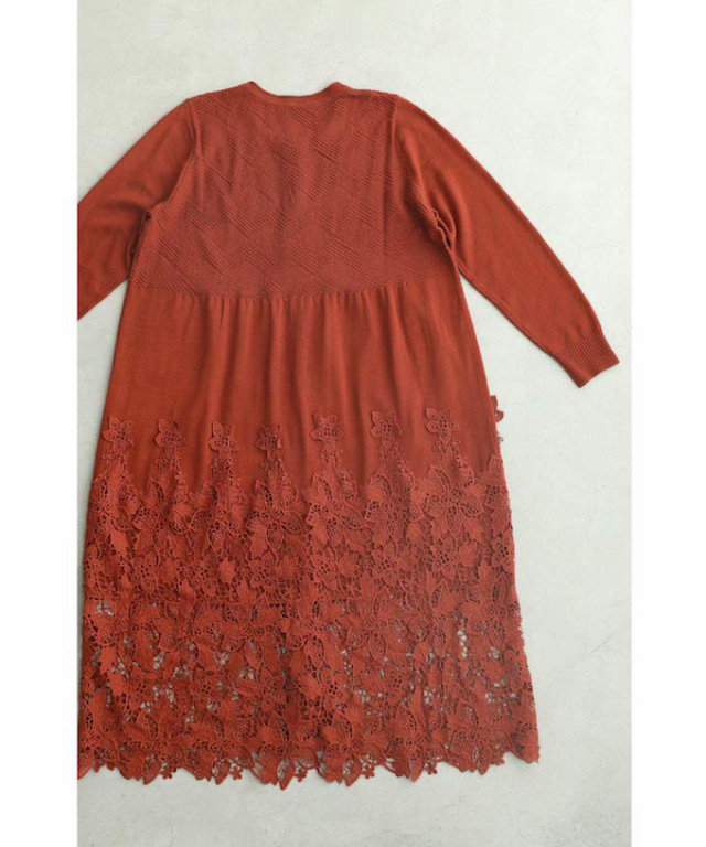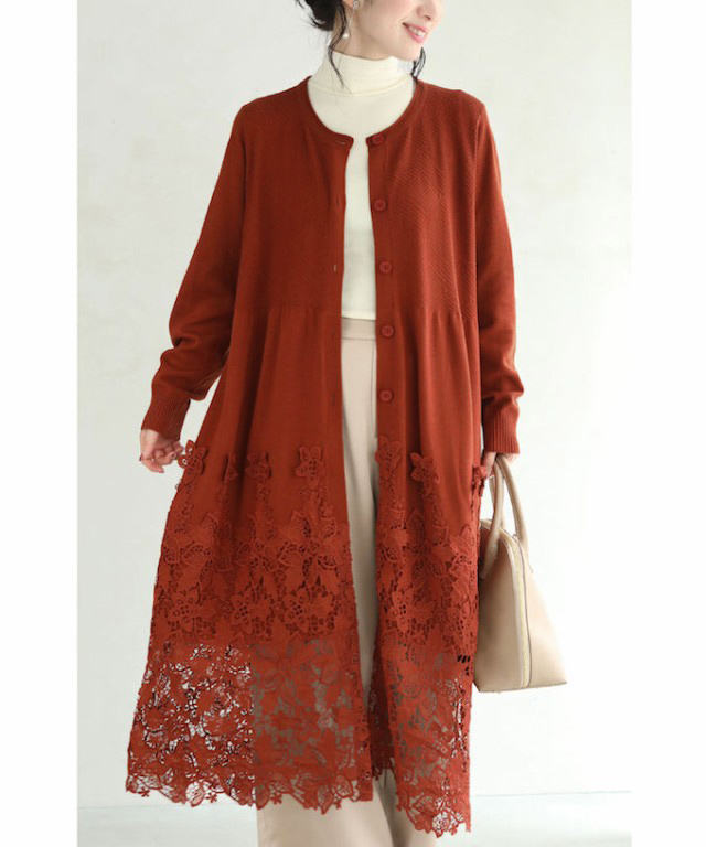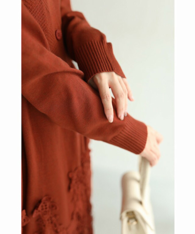 「美しさ湧き上がる花レースのロングニットカーディガン」