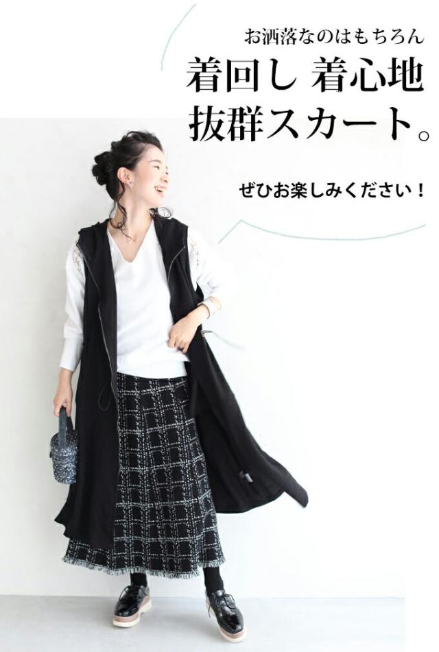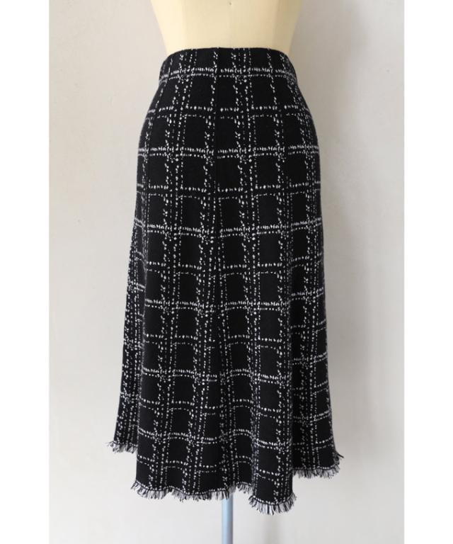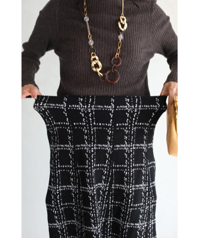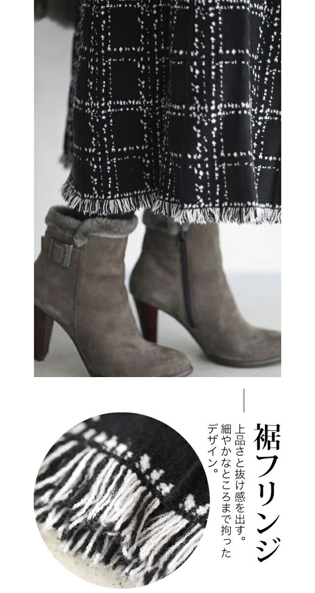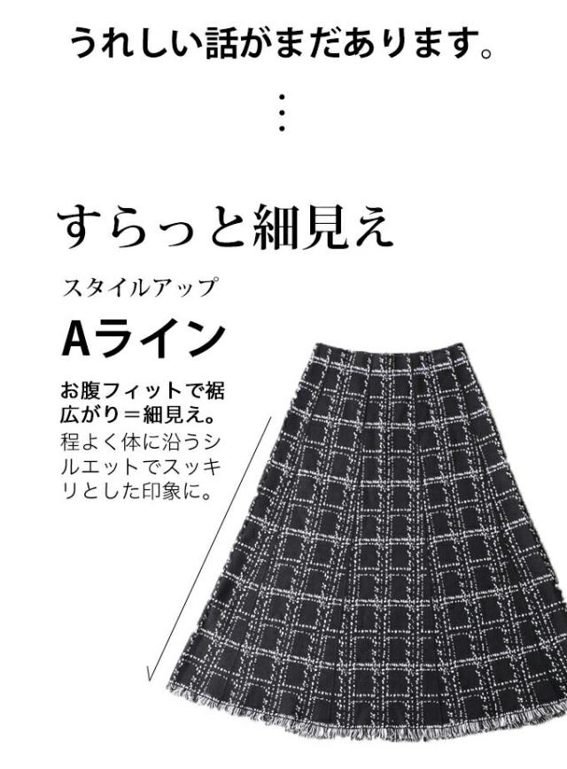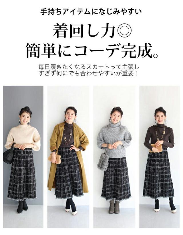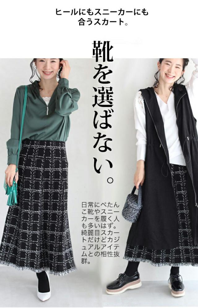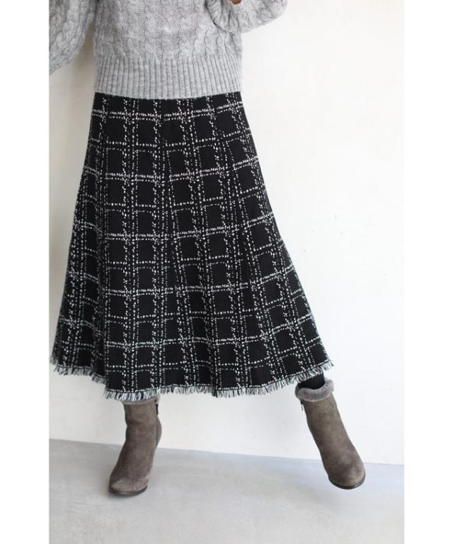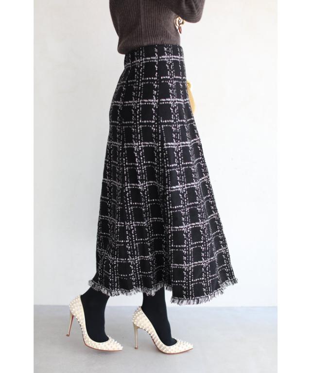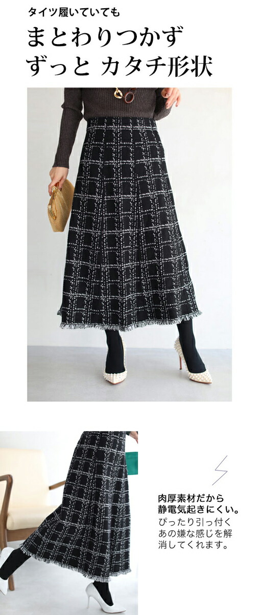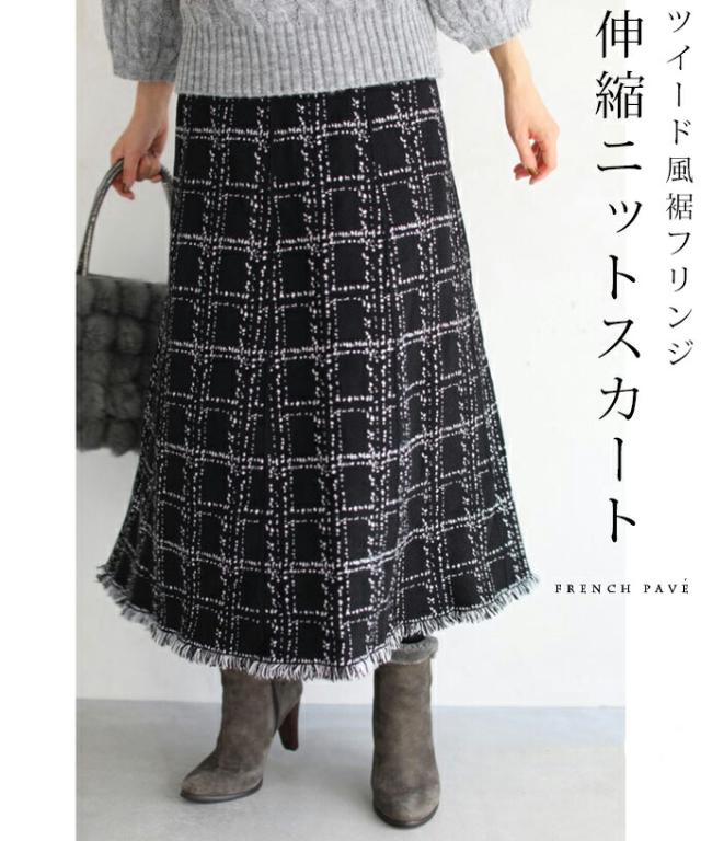 20251213sale チェック スカート w53168 (黒) 裾フリンジが 可愛い ツイード風 ニット ミディアム cawaii ロングスカート 膝丈 ウエストゴム ゆったり 暖かい お呼ばれ 通勤 オフィス きれいめ 上品 ミセス 60代 40代 50代 30代