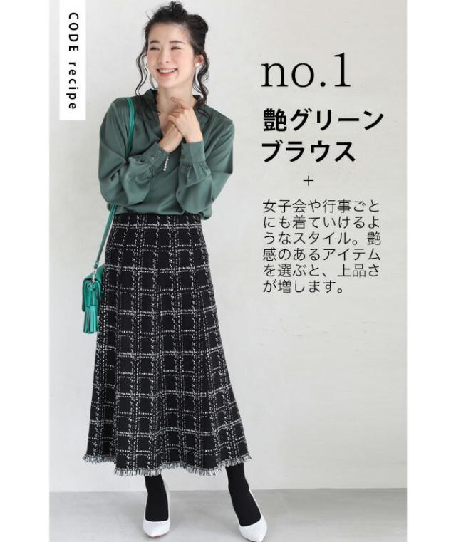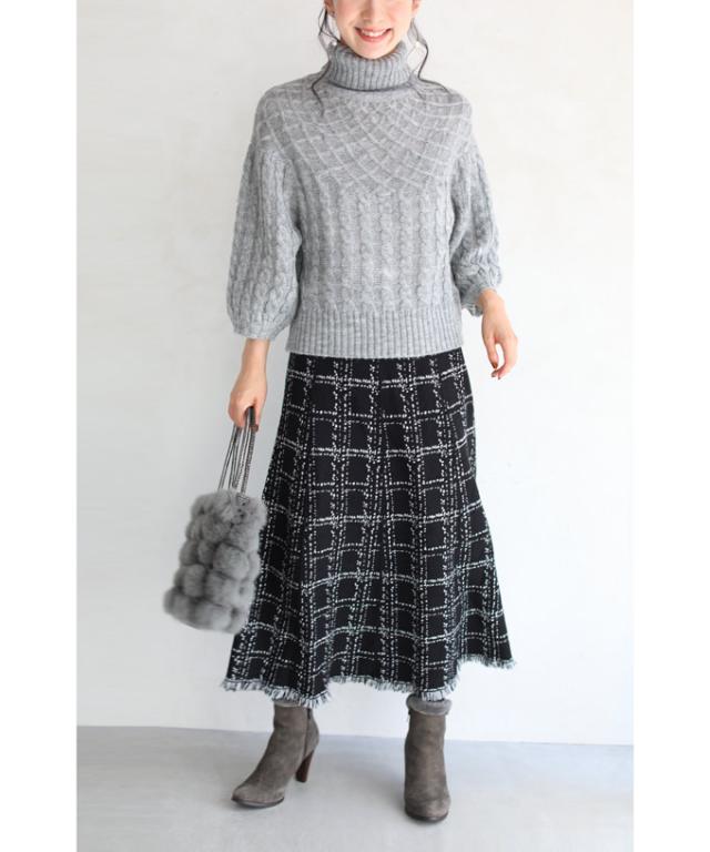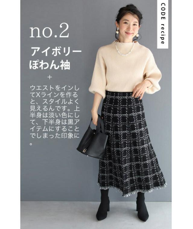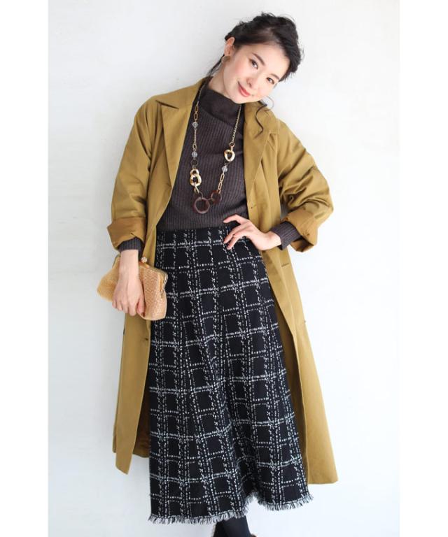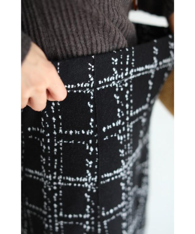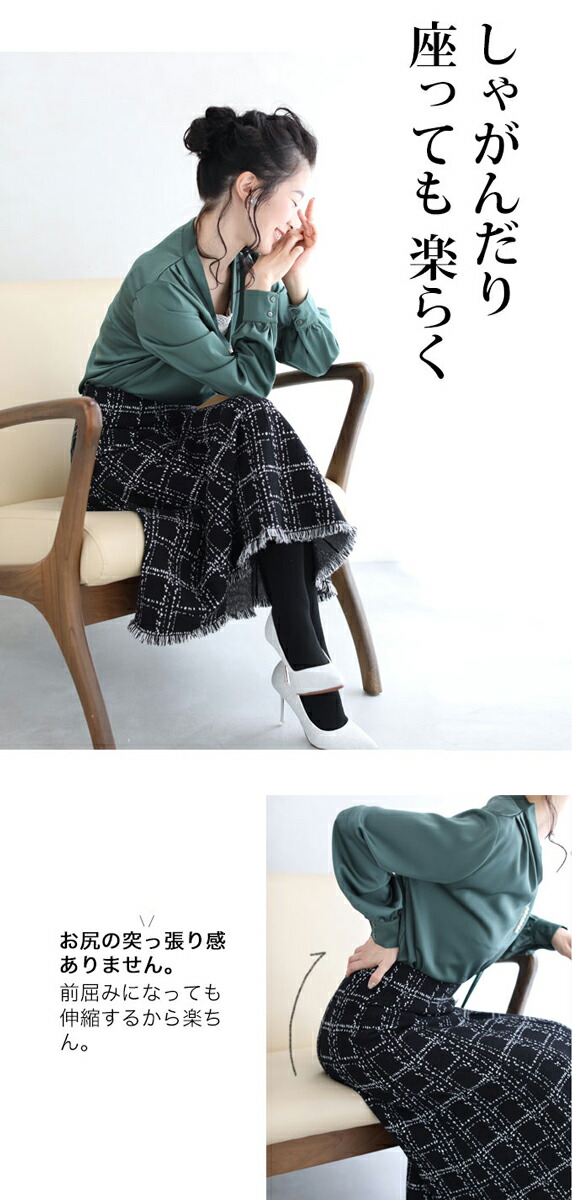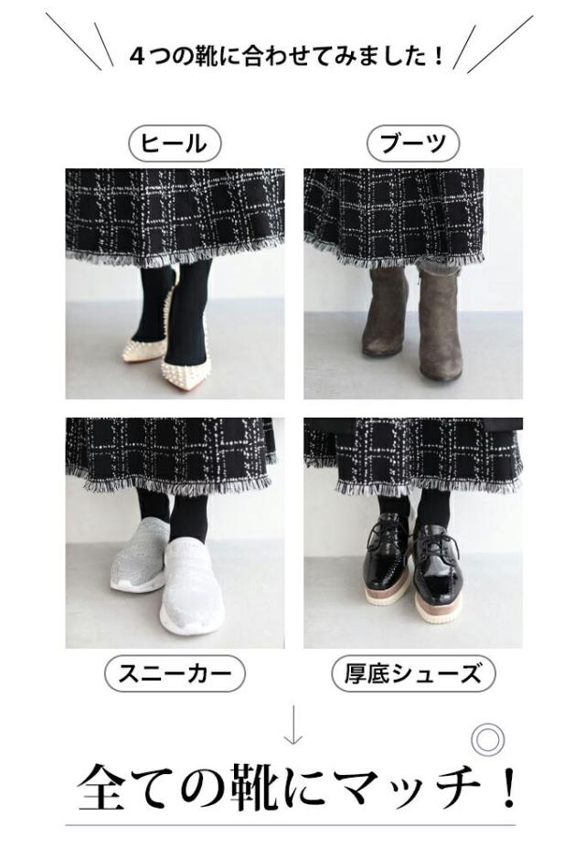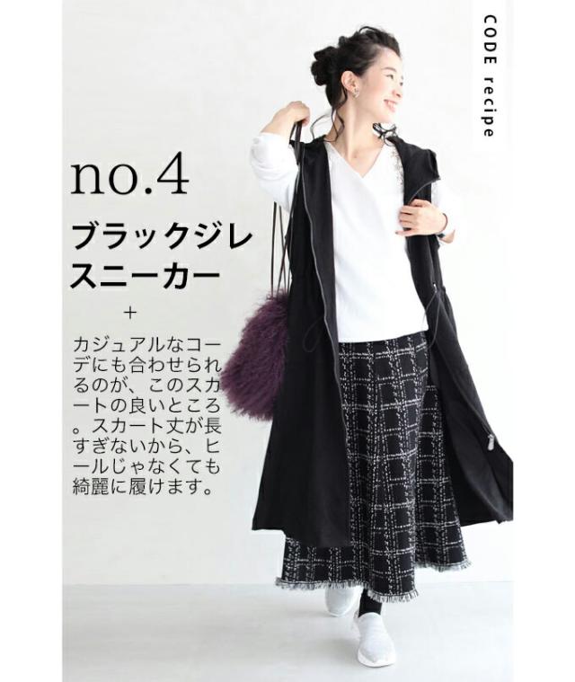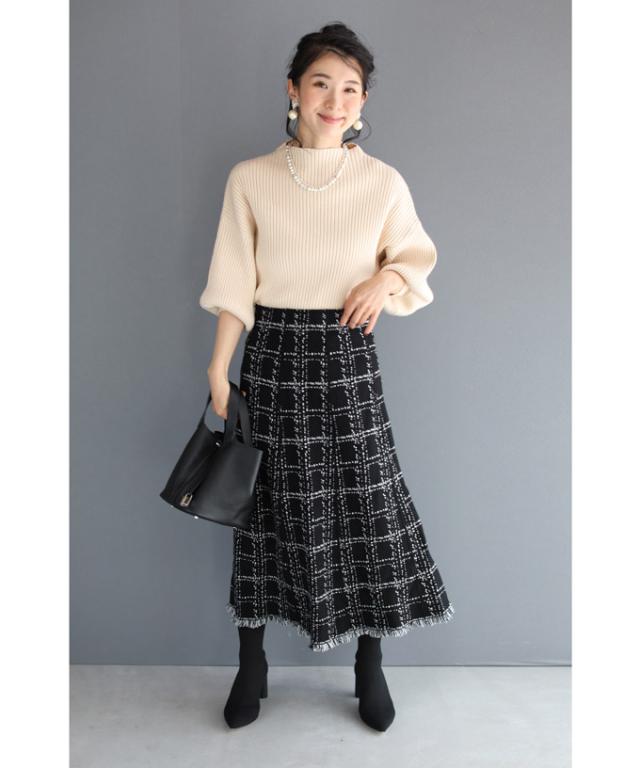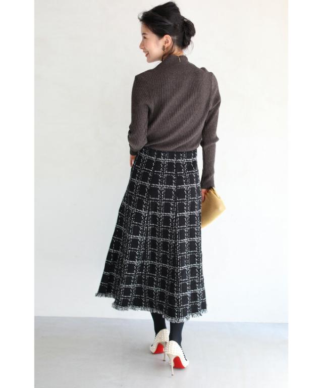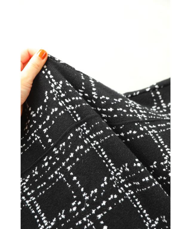 20251213sale チェック スカート w53168 (黒) 裾フリンジが 可愛い ツイード風 ニット ミディアム cawaii ロングスカート 膝丈 ウエストゴム ゆったり 暖かい お呼ばれ 通勤 オフィス きれいめ 上品 ミセス 60代 40代 50代 30代