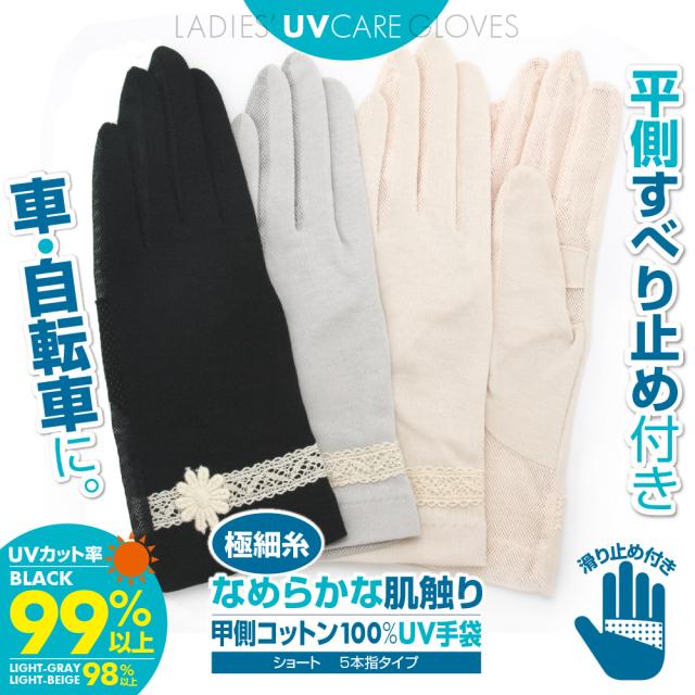 レディース 甲側コットン100%平側メッシュ 花モチーフ&レース装飾UVカット手袋 ショート 滑り止め付き 5本指タイプ 全3色