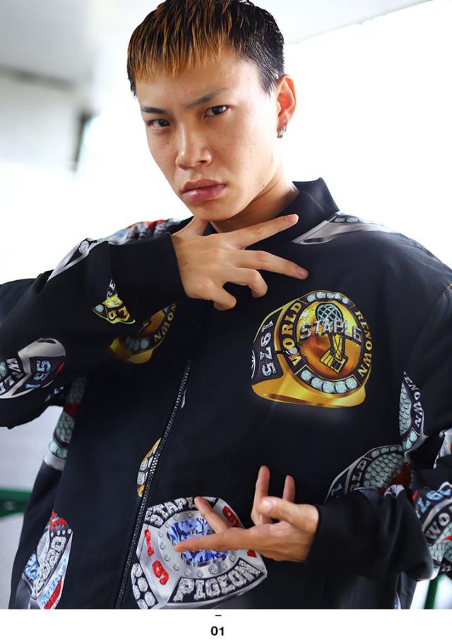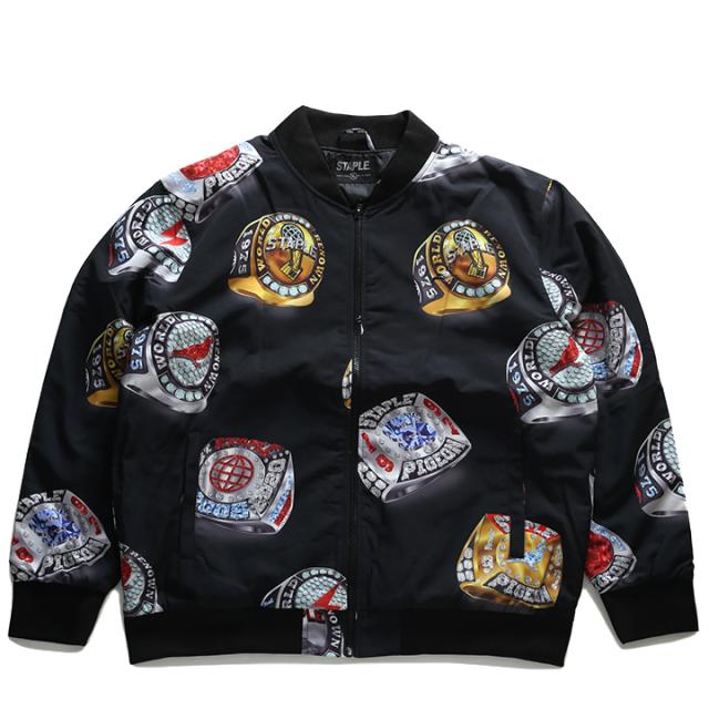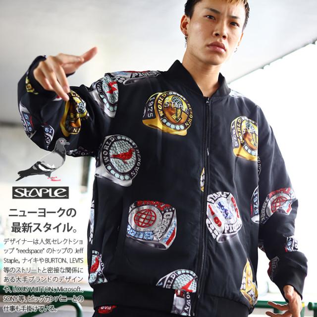表地にナイロン、裏地に中綿保温材入りのライナーを採用した、”ラグジュアリーなリング”が存在感を放つフルジップアップのボンバージャケット。アメリカのメジャースポーツを象徴するチャンピオンリングをSTAPLEならではのグラフィックでモディファイした総柄デザイン。ローテクからハイテク系まで幅広いスニーカーと合わせたいオススメの1着。ゆったりしたサイズ感がカッコイイ、イマっぽいビッグシルエット。