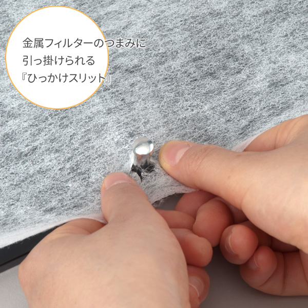 金属フィルターのつまみに引っ掛けられる『ひっかけスリット』がついているので、隙間なくピッタリ装着できます。