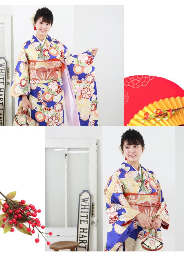 最大20日間レンタル 成人式 振袖 レンタル 20点フルセット 派手 「青地に黄色流水と菊・雪輪」 成人式 結婚式 フォーマル 小紋柄 日本製生地